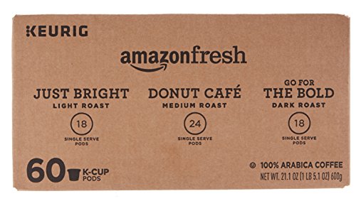 Using only high quality Arabica beans, we expertly blend and roast our light, medium, and dark roast coffees to unlock rich aromas and layers of flavor. Just Bright is our light roast coffee with crisp and clean flavor. Donut Café is our classic medium to light roast coffee with smooth, balanced flavor. Go for the Bold is our full bodied dark roast coffee with rich flavor. Try them all with our AmazonFresh K Cup Variety Pack. Enjoy singular satisfaction in every cup, every time, with AmazonFresh k cups, compatible with Keurig brewers.