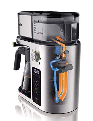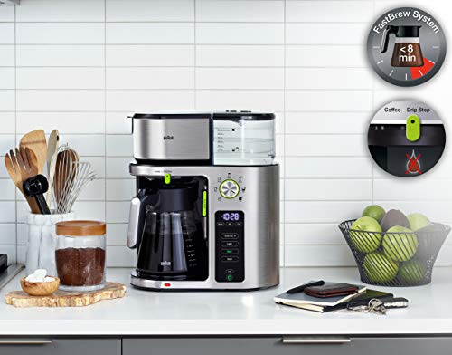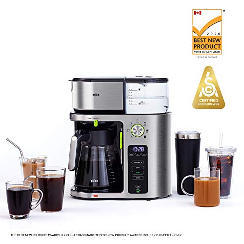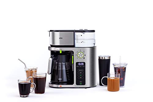 Bring the coffee bar to you with this Braun KF9070SI Multi-serve Coffee Maker. From single-serve to multi-serve and everything in between, this drip coffee machine easily adapts to your needs and coffee preferences. The ExactBrew System delivers consistent, optimal brewing with every cup, automatically calculating the precise water flow, temperature, and speed. With the touch of a button, BrewChoice Plus lets you customize your coffee to your liking, from light to bold, and even iced. The convenient MultiServe Dial System makes it easy to brew as much or as little as you need, ranging from a pod-free single cup to a full 10-cup carafe of coffee, delivered in less than 8 minutes without sacrificing taste. Always know your brewed coffee is fresh with a visible Freshness Indicator display. Certified as a Golden Cup by the Specialty Coffee Association, you’re guaranteed great tasting drip coffee, cup after cup. Sleek and streamlined with a stainless steel design, this Braun MultiServe Coffee Maker offers the convenience and versatility you crave, while never compromising the quality of your brew. Enjoy drip coffee, evolved.