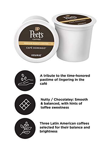 Peet’s Coffee Café Domingo, Medium Roast, Single Serve K-Cup Coffee Pods for Keurig Coffee Maker; Great coffee brings friends and neighbors together like nothing else. That’s why we created this medium roast to pay tribute to the time-honored pastime of lingering in the café, casually sipping an expertly brewed cup over conversation. The three Latin American coffees in this carefully crafted blend were selected for their balance and brightness, and the roast fine-tuned to brew the perfect medium-bodied cup. We decided to name it after our third café, opened by Alfred Peet in 1980 on Domingo Avenue in Berkeley, in the shadow of the Claremont Hotel. For more than three decades, Peet’s regulars have gathered here to enjoy hand-crafted drinks and the camaraderie they inspire. And that’s something worth commemorating.