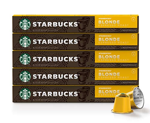 Package contains 5 boxes of 10 Starbucks Blonde Espresso Roast Nespresso Capsules to make up to 50 cups